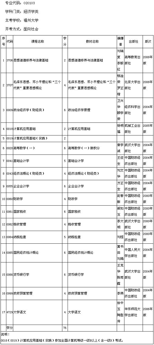 福建省2013年福州大學自考財稅(專科)考試計劃