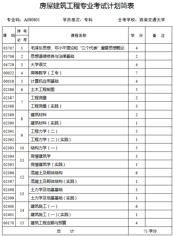 四川省2013年自考建筑房屋工程專業(專科)考試計劃