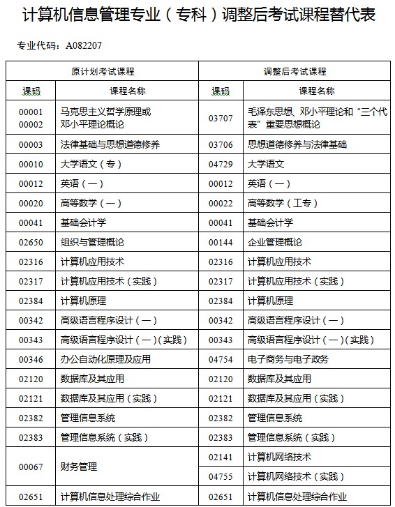 四川省2013年自考計算機信息管理專業(yè)(專科)調(diào)整后課程替代表