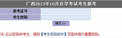 廣西省2013年10月自考報名時間為8月28日至9月1日,現已開始報名,大家可以點擊下面的鏈接或圖片進入廣西自學考試網上系統進行報名(請點擊網頁上方的“考生報考”)。