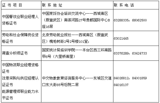證書課程的注冊(cè)、報(bào)考工作實(shí)行網(wǎng)上集體辦理,不接受零散考生的注冊(cè)、報(bào)考,不實(shí)行網(wǎng)上繳費(fèi)。各證書合作開考單位負(fù)責(zé)收取本單位開考項(xiàng)目的報(bào)考費(fèi),并在10月30日前向北京教育考試院繳納費(fèi)用。請(qǐng)考生與合作開考單位聯(lián)系注冊(cè)、報(bào)考、繳費(fèi)事宜,聯(lián)系地址及電話見下表: