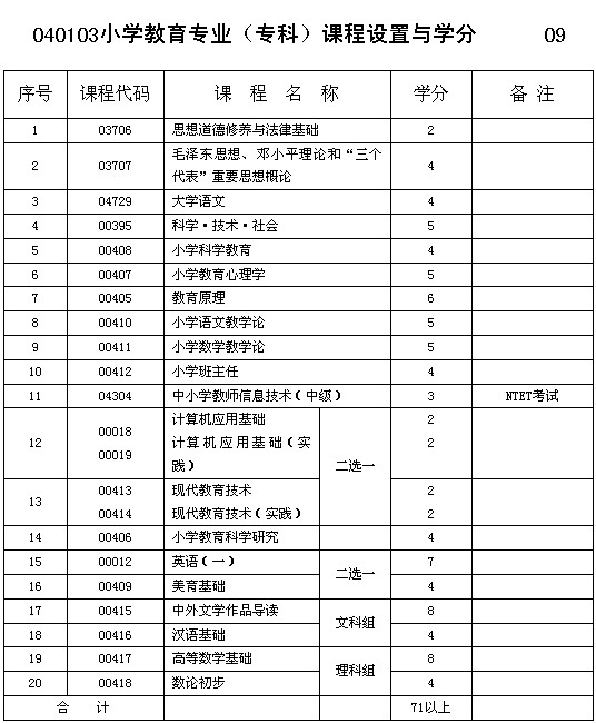 重慶市2013年自考小學教育專業(專科)課程設置與學分