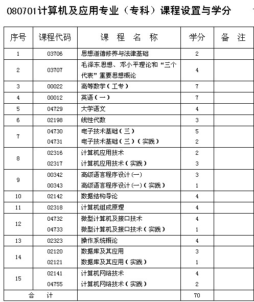 重慶市2013年自考計算機及應用專業(專科)課程設置與學分