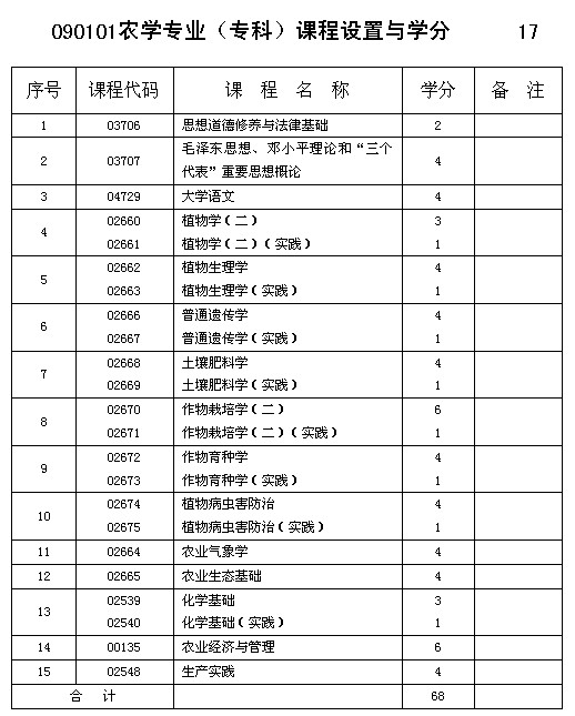 重慶市2013年自考農學專業(專科)課程設置與學分
