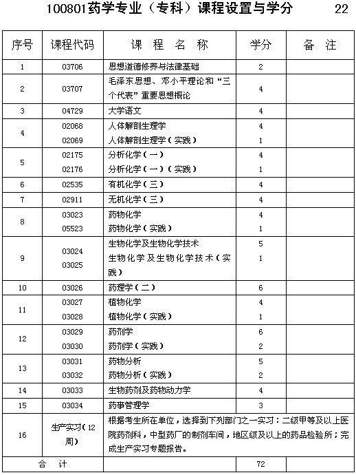 重慶市自考藥學專業(專科)課程設置與學分
