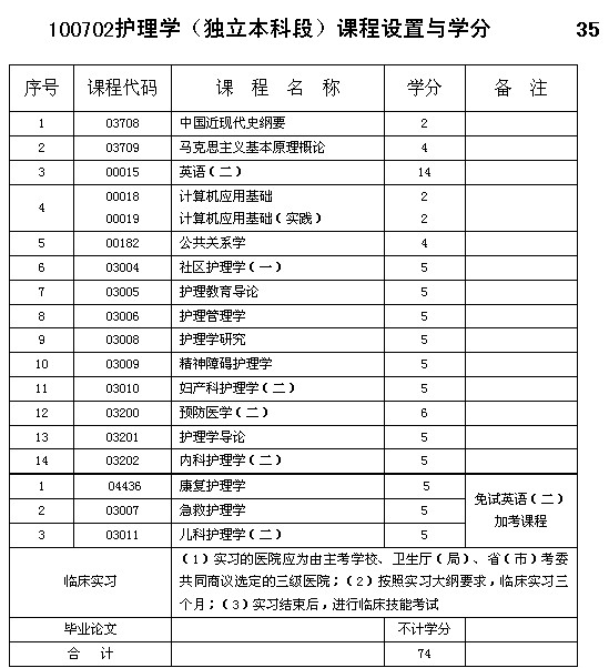 重慶市自考護理學專業(獨立本科段)課程設置與學分