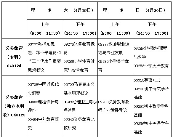 2014年4月江西省自學考試義務教育專業課程考試時間安排表