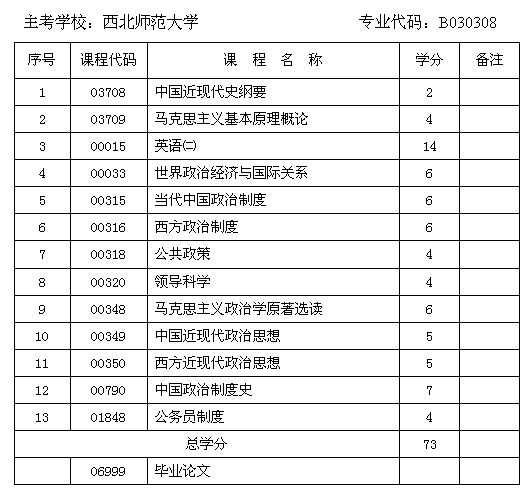 摘要 甘肅省自考政治學專業(本科)課程設置與學分