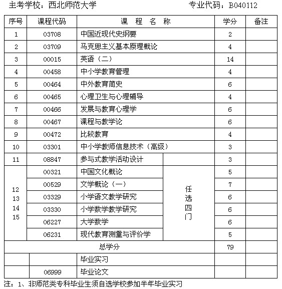 甘肅省自考小學教育專業(本科)課程設置與學分