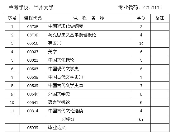 甘肅省自考漢語言文學專業(本科)課程設置與學分