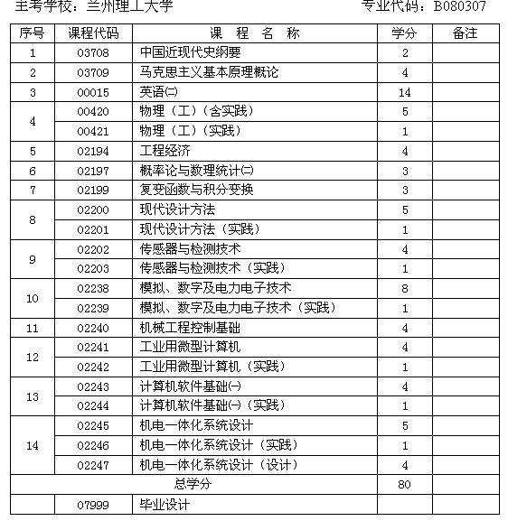 甘肅省自考機電一體化工程專業(本科)課程設置與學分