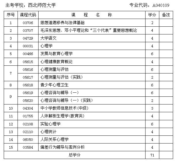 甘肅省自考心理健康教育專業(?疲┱n程設置與學分