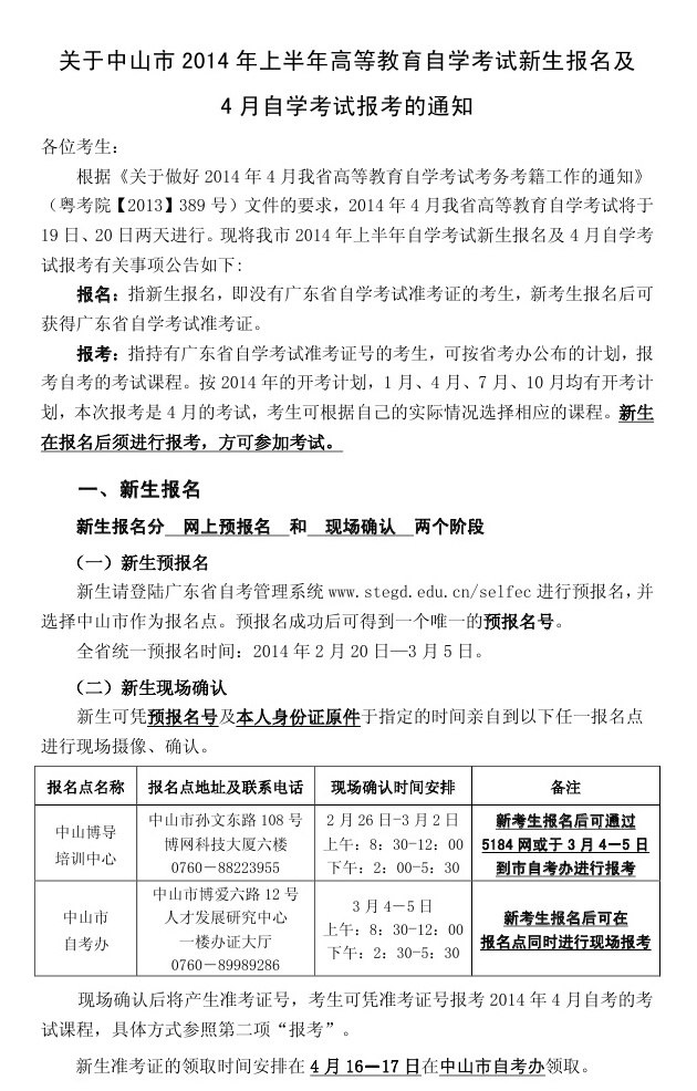 摘要 廣東中山市2014年4月自考報名通知,由環球網校自考頻道為您提供!