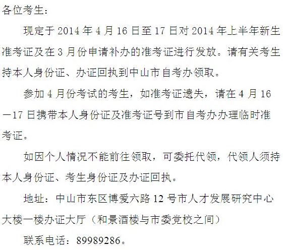 廣東中山市2014年4月自考準考證領取及補辦通知