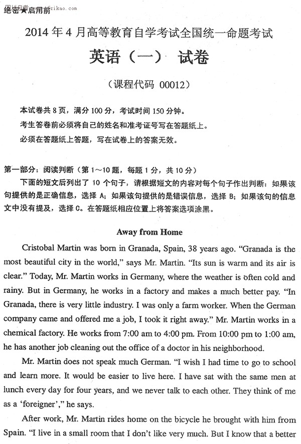 摘要 全國2014年4月自考英語(一)真題,由環(huán)球網校自考頻道為您整理發(fā)布!