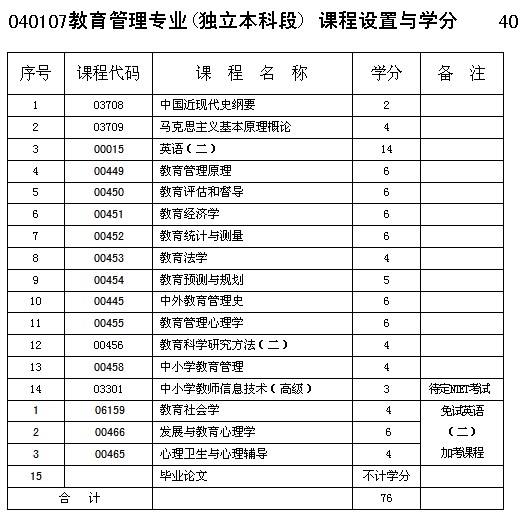 重慶市自考教育管理專業(獨立本科段)課程設置與學分