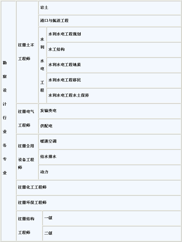 1、全國勘察設(shè)計注冊工程師執(zhí)業(yè)資格考試為非滾動類考試,參加基礎(chǔ)考試或?qū)I(yè)考試的考生均應(yīng)在一個考試年度內(nèi)通過全部科目的考試方可獲得執(zhí)業(yè)資格證書。考生可根據(jù)自己的專業(yè)學(xué)歷、業(yè)務(wù)專長,從以下專業(yè)中選報。