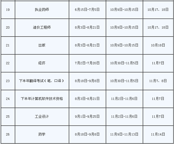 根據人力資源社會保障部辦公廳《關于2015年度專業技術人員資格考試計劃及有關問題的通知》(人社廳發〔2014〕126號)通知精神,為便于我省專業技術人員報考資格考試,現將我省專業資格考試和省直考區計算機應用能力報名時間通知如下: