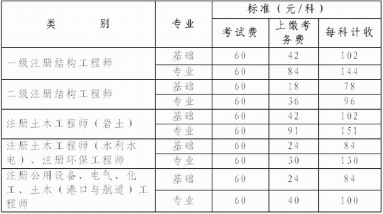 根據(jù)計辦價格〔2000〕299號、計價格〔2002〕2546號、發(fā)改價格〔2007〕55號、發(fā)改價格〔2009〕1003號、皖價費〔2006〕240號、皖價費函〔2007〕130號、皖價費函〔2009〕104號、皖價費函〔2009〕198號等文件規(guī)定,2011年勘察設(shè)計注冊工程師執(zhí)業(yè)資格考試的收費標準為: