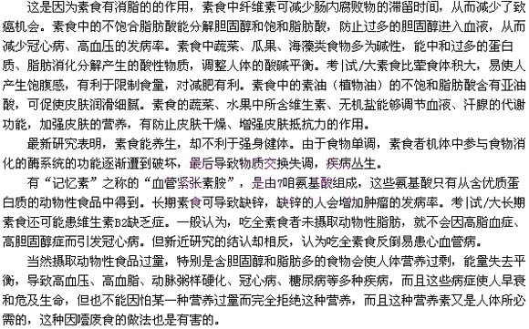 關于膳食的葷素在國內外長期以來爭論很多,近年來,國內外隨著“富裕病”的逐漸增多,人們對素食越來越感興趣,刮起了一股提倡吃素食的“新素食主義”風潮。其主要依據是人類的生理構造,在消化系統和其他生理構造方面,與吃蔬菜動物或食草動物非常相象,卻與肉食動力差別很大;人類沒有尖銳突出的犬牙,只有平坦的日齒可以磨碎食物;人類消化腺分泌的消化液特別有利于對素食進行消化;人類的胃酸與肉食動物的胃酸相比,在數量、濃度、強度上只有肉食動物的 1/20;人類腸道的長度是身長的12倍,比肉食動物的腸道長2倍以上。根據這些報告,似乎可以得出結論,人類適合素食。