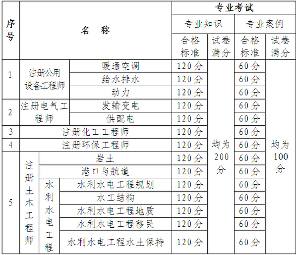 (二)注冊工程師(除一級、二級注冊結構工程師)資格的專業考試合格標準見下表: