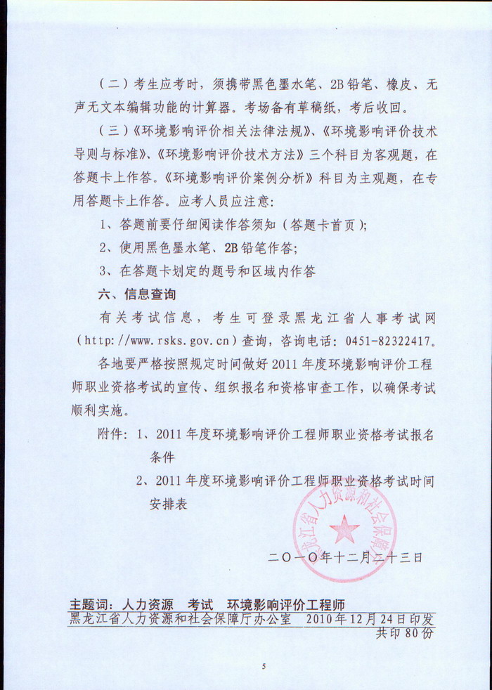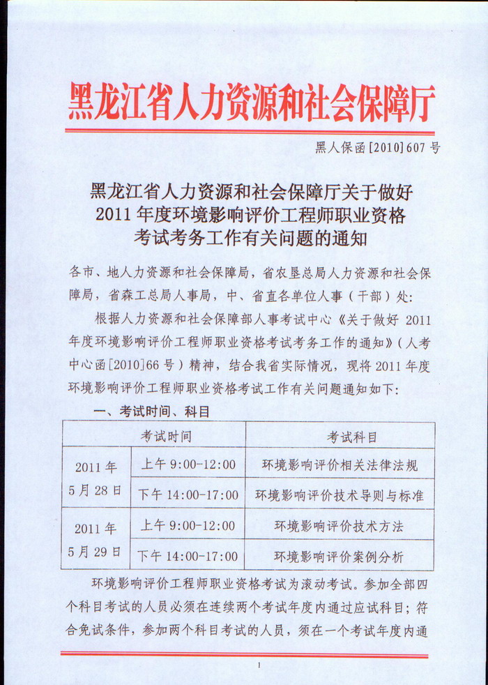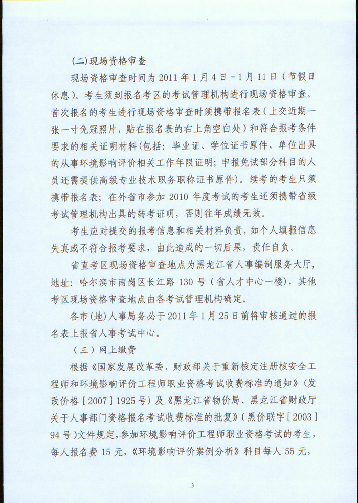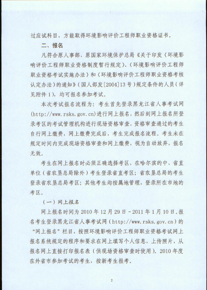 黑龍江2011年環(huán)境影響評價師考試報名12月29日-1月10日