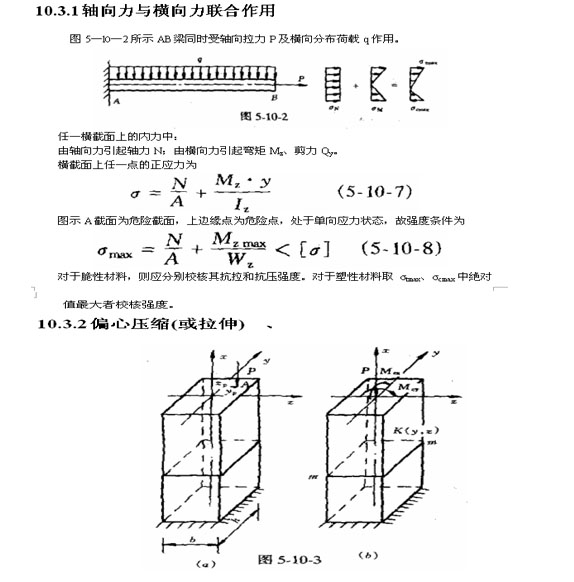 圖5―1―3所示桿件受偏心壓力(或拉力)作用時,將同時產(chǎn)生軸向壓縮(拉伸)和平面彎曲兩種基本變形。