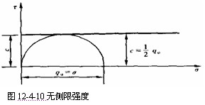 無側限又稱單軸壓縮試驗。相當于三軸試驗中σ3=0的條件。試驗結果只能得到一個應力圓,見圖12-4-10。若抗壓強度為qu'則不排水強度