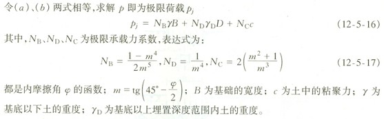 。見圖12-5-11 (b)所示。基礎底面以下土體發生主動破壞,稱為主動區;基底外土體發生被動破壞,稱為被動區。滑動面由兩個平面所組成。建立主動區與被動區界面ab面的平衡條件,見圖12-5-11 (c)所示。