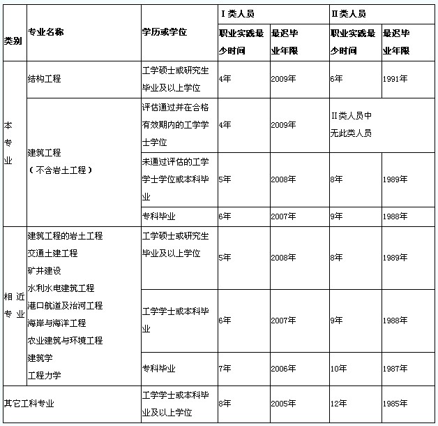 注:表中“Ⅰ類人員”指基礎(chǔ)考試已經(jīng)通過,繼續(xù)報考專業(yè)考試的人員;“Ⅱ類人員”指符合免基礎(chǔ)考試條件只參加專業(yè)考試的人員,該類人員可一直報考專業(yè)考試,直至通過為止。