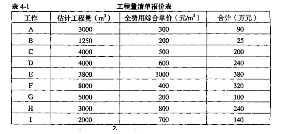 四、某工程,施工單位按招標文件中提供的工程量清單作出報價(表4-1)o施工合同約定:工程預付款為合同總價的20%,從工程進度款累計總額達到合同總價10%的月份開始,按當月工程進度款的30%扣回,扣完為止;施工過程中發生的設計變更,采用以直接費為計算基礎的全費用綜合單價計價,間接費費率10%,利潤率5%,計稅系數3.41%。經項目監理機構批準的施工進度計劃如圖4-1所示(時間單位:月)。