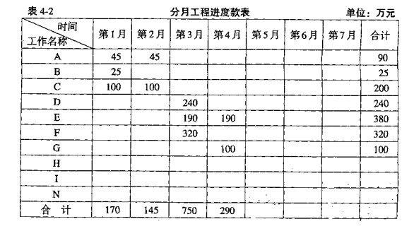 4.若該工程的各項工作均按最早開始時間安排,各工作均按勻速完成,且各工作實際工程量與估計工程量無差異,在表4-2中填入H、I、N三項工作分月工程進度款。
