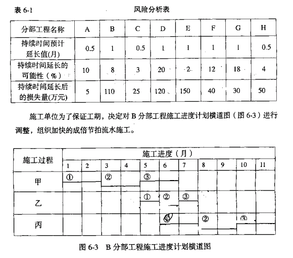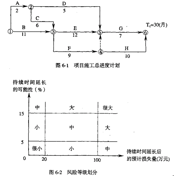 六、某工程,施工單位向項.目監理機構提交了項目施工總進度計劃(圖6-1)和各分部工程的施工進度計劃。項目監理機構建立了各分部工程的持續時間延長的風險等級劃分圖(圖6-2)和風險分析表(表6―1),要求施工單位對風險等級在“大”和“很大”范圍內的分部工程均要制定相應的風險預防措施。