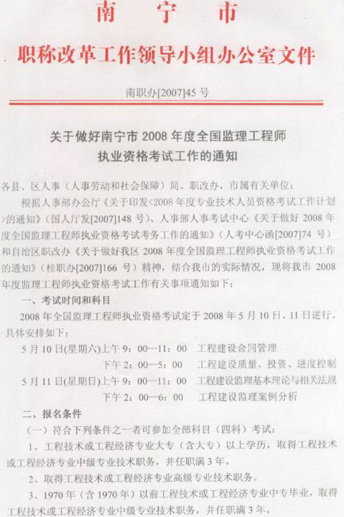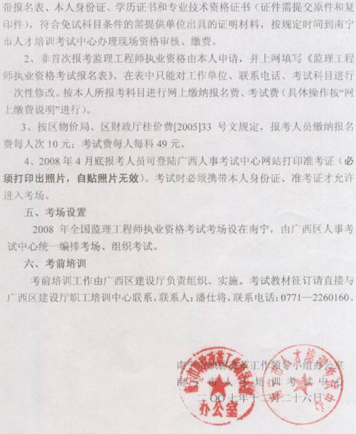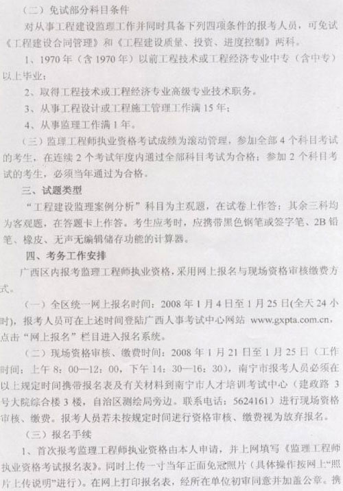 南寧2008年監(jiān)理工程師考試1.4日?qǐng)?bào)名