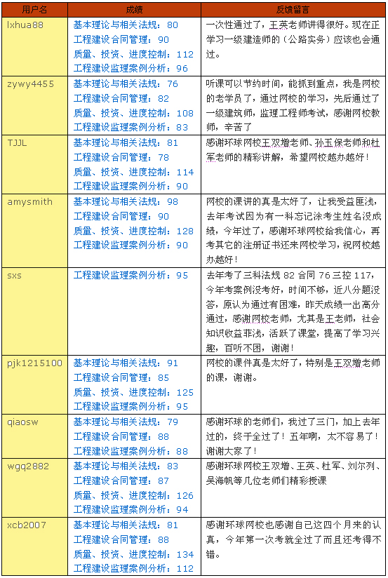 1、網校大部分學員對本年度的輔導表示贊揚,認為網校的課程無論是對幫助學員學習知識還是幫助復習考試都起到了非常大的作用,尤其對王雙增和王英兩位老師,大家一致表示授課認真、知識點講解透徹、大綱和知識點把握準確;