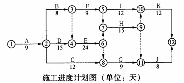 某實(shí)施監(jiān)理的工程,建設(shè)單位與施工單位按照“建設(shè)工程施工合同(示范文本)”簽訂了施工合同。項(xiàng)目監(jiān)理機(jī)構(gòu)批準(zhǔn)的施工進(jìn)度計(jì)劃如下圖所示,各項(xiàng)工作均按最早開始時(shí)間安排,勻速進(jìn)行。