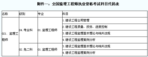附件一:全國監理工程師執業資格考試科目代碼表