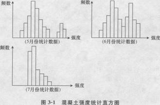 事件3:B、C兩個標段5、6、7三個月混凝土試塊抗壓強度統計數據的直方圖如圖3―1