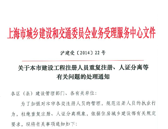 關(guān)于本市建設(shè)工程注冊人員重復(fù)注冊、人證分離等有關(guān)問題的處理通知