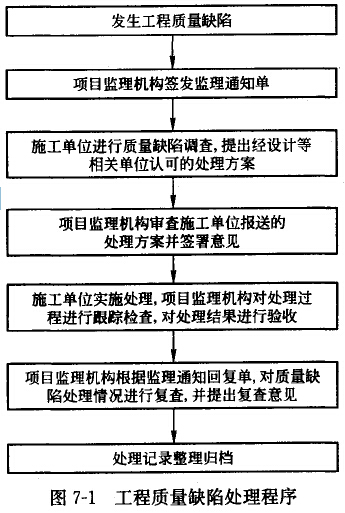 工程施工過程中,由于種種主觀和客觀原因,出現質量缺陷往往難以避免。對已發生的質量缺陷,項目監理機構應按下列程序進行處理,如圖7-1所示。