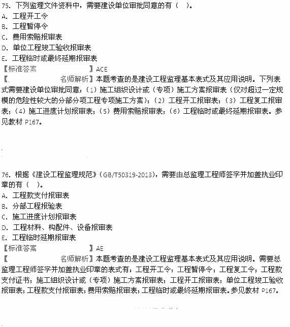 【老師解析】本題考查的是建設工程監理主要文件資料分類及編制要求。建設工程監理主要文件資料包括:(1)勘察設計文件、建設工程監理合同及其他合同文件;(2)監理規劃、監理實施細則;(3)設計交底和圖紙會審會議紀要;(4)施工組織設計、(專項)施工方案、施工進度計劃報審文件資料;(5)分包單位資格報審會議紀要;(6)施工控制測量成果報驗文件資料;(7)總監理工程師任命書,工程開工令、暫停令、復工令,開工或復工報審文件資料;(8)工程材料,構配件,設備報驗文件資料;(9)見證取樣和平行檢驗文件資料;(10)工程質量檢驗報驗資料及工程有關驗收資料;(11)工程變更、費用索賠及工程延期文件資料;(12)工程計量、工程款支付文件資料;(13)監理通知單、工程聯系單與監理報告;(14)第一次工地會議,監理例會、專題會議等會議紀要;(15)監理月報、監理日志、旁站記錄;(16)工程質量或安全生產事故處理文件資料;(17)工程質量評估報告及竣工驗收監理文件資料;(18)監理工作總結。參見教材P168。
