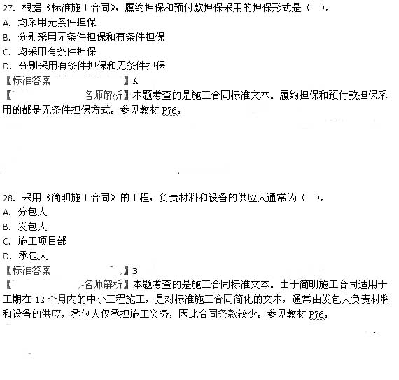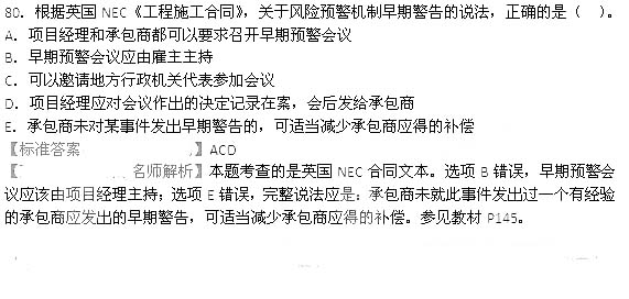 【老師解析】本題考查的是訂立合同時(shí)需要明確的內(nèi)容。承包人應(yīng)認(rèn)真閱讀、復(fù)核發(fā)包人要求,發(fā)現(xiàn)錯(cuò)誤的,應(yīng)及時(shí)書(shū)面通知發(fā)包人。發(fā)包人對(duì)錯(cuò)誤的修改,按變更對(duì)待。對(duì)于發(fā)包人要求中錯(cuò)誤導(dǎo)致承包人受到損失的后果責(zé)任,通用條款給出了兩種供選擇的條款:無(wú)條件補(bǔ)償條款和有條件補(bǔ)償條款。由于兩個(gè)條款的責(zé)任不同,應(yīng)明確本合同采用哪一條款。參見(jiàn)教材P114。