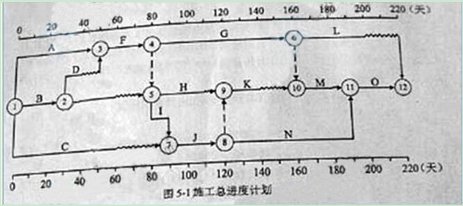 某工程,建設單位與施工單位簽訂了施工合同,合同工期為220天。經總監理工程師批準的施工總進度如圖5-1所示,各項工作均按最早開始時間安排且勻速施工。