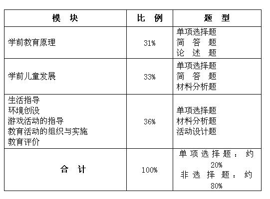 考試內(nèi)容主要涵蓋學(xué)前兒童發(fā)展、學(xué)前教育原理、生活指導(dǎo)、環(huán)境創(chuàng)設(shè)、游戲活動(dòng)的指導(dǎo)、教育活動(dòng)的組織與實(shí)施、教育評(píng)價(jià)等七個(gè)模塊。能力要求分為了解、理解、熟悉、掌握、運(yùn)用五個(gè)層次。