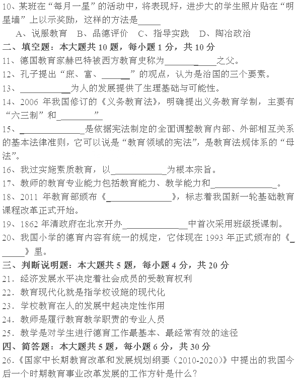 11.科學教育學 12.教 13.遺傳素質 14.“五四制”15.教育基本法律16.提高國民素質