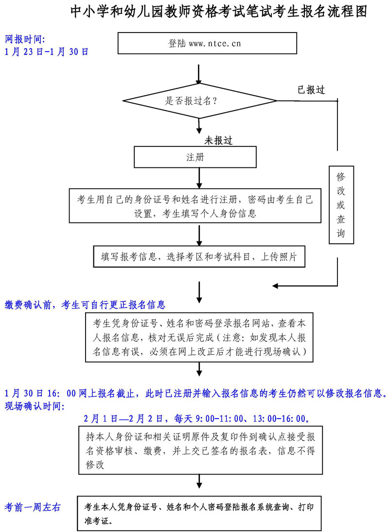 2013年上半年筆試報名采用網上報名信息輸入和現場確認相結合的辦法。其中,網上信息輸入時間為2013年1月23日9:00 -- 30日16:00,現場確認時間為2013年2月1日-2日,每天9:00-11:00、13:00-16:00。
