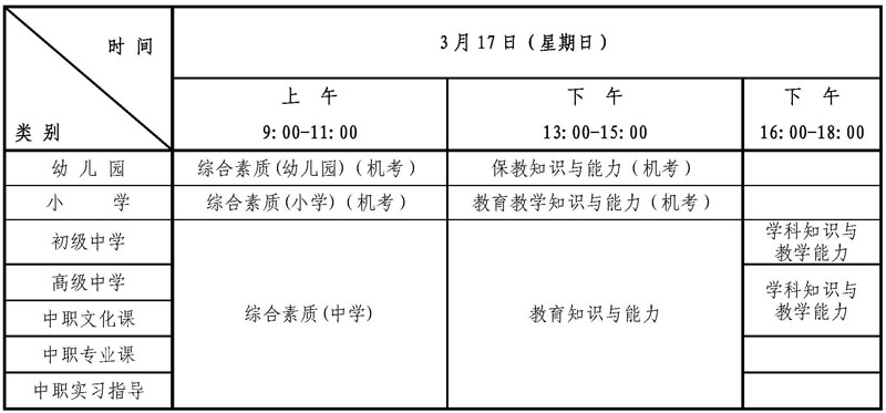 申請中等職業學校專業課和中等職業學校實習指導教師資格的人員參加高級中學教師資格考試綜合素質和教育知識與能力兩科考試。專業知識與教學能力考試,主要結合面試進行考查,必要時進行筆試。