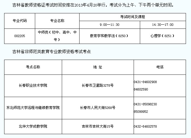 吉林省2013年4月教師資格證考試時間及考點