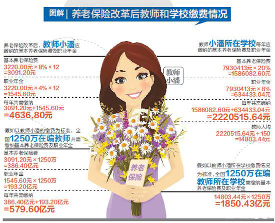 據(jù)統(tǒng)計,2013年,全國各級各類學(xué)校專任教師為1476.82萬人,扣除民辦幼兒園教師、公辦幼兒園非在編教師以及其他民辦學(xué)校教師,需要財政支付工資的教師約1250萬人。楊立雄和記者一起算了一下,如果視小潘每年4636.8元的繳費(fèi)為全國教師平均水平,全國1300多萬名教師每年個人的繳費(fèi)總額約為580億元。按小潘所在學(xué)校每年為每名教師承擔(dān)14803.44元計算,1250萬名教師就需要1850億元。如果教師個人繳納的這部分需要用工資調(diào)整來抵消的話,相當(dāng)于每年教育財政要多支出約2430億元。而且,這僅僅是估算,并沒有將學(xué)校在編的其他教輔和后勤人員的養(yǎng)老保險繳費(fèi)支出計算在內(nèi)。