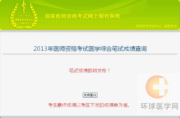摘要 2013年醫師資格考試醫學綜合筆試成績查詢即將開始,環球網校醫學網會第一時間公布查詢時間,敬請廣大考生隨時關注我網站的考試動態。